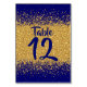 This modern wedding table number card has a sprinkled gold confetti effect on a rich royal blue background. A striking design for your special day. Also available are matching wedding place cards and menus. The font's style, colour and placement can also be changed any way you like.