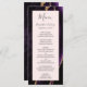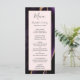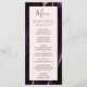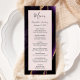 This elegant, modern wedding menu features a watercolor purple agate background trimmed with gold faux glitter. The text appears in elegant charcoal grey handwriting and copperplate fonts on a blush pink rectangle. The agate design is repeated on the reverse.