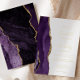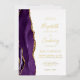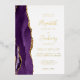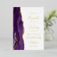 The left-hand edge of this elegant modern wedding invitation features a purple watercolor agate border trimmed with faux gold glitter. The customizable text combines handwriting, copperplate and italic fonts in real gold foil on a white background. The reverse side features a matching purple and gold agate design.