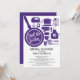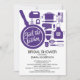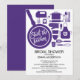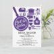 Stylish Purple & white stock the kitchen wedding shower invitation featuring kitchen tools including a frying pan, hand mixer, kitchen timer, pot, utensils, apron, whisk, measuring cup, pot holder & cups. Visit our shop to view this kitchen shower invite in other colours & matching recipe cards