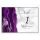 The left-hand edge of this elegant modern wedding table number card features a purple watercolor agate border trimmed with faux silver glitter. The customizable text combines dark purple handwriting script with black italic and copperplate fonts on a grey and white marble background.