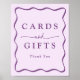 Add a stylish touch to your wedding, bridal shower, baby shower, graduation party, or other special event with this Modern Purple Wavy Frame cards and gifts sign. The design features "Cards and Gifts" in bold purple lettering surrounded by a purple wavy border contrasting with a light purple background. Personalize the retro cards and gifts sign with your custom text below. Choose between professional printing or instant download options, providing flexibility for your convenience.