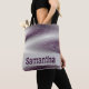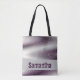 Are you looking for a stylish tote to hold all of your on-the-go needs? This tote bag features a bold and modern pattern in purple and white. The glossy diagonal lines appear on both the front and back of this contemporary tote bag. A solid light purple banner appears at the bottom and can be personalize quickly and easily.