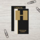 A modern and professional business card using black, gold, and ivory for a man or woman. Your initial on the front is to be personalized with your full name or business name. On the back is a QR code to add a "call to action." Also your name, title, address, phone, email, website, and social media information. Minimalist and professional to represent your brand or business. Fully editable-change the background and text colour to reflect your branding.
