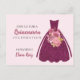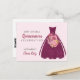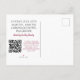 Modern Quinceañera party invitation postcard features floral and glitter ballgown on pale pink background. Customize details including QR code