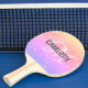 Modern ping pong paddle with a girly, rainbow glitter background, a hand lettered script and a monogram. Personalize with your initial and name.