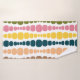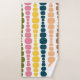 This towel set has a mid-century modern design of vertical lines of rounded rectangles in increasing and decreasing size in retro colours of red, green, blue, yellow, orange, and brown on a field of white.