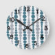 This all clock has a mid-century modern design of teal and gray rounded rectangles in increasing and decreasing size running vertically on a field of white.