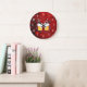 A clock with a modern abstract pattern. Red and black colors swirl, mix and mingle together. Creative, artistic and unique with a dark, mysterious flair. A pair of foamy frothy beer glasses clink together in celebration.