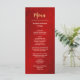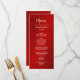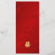 This modern Chinese wedding menu card features an artistic gold double happiness symbol on a shimmering red background. With custom bride and groom names, the wedding date and a custom menu text in a modern handwritten script.