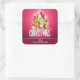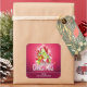 Stickers with a bright and festive Christmas graphic design. The text says Merry Christmas & Happy New Year. Designed with a tree shaped mound of presents with festive snowflakes, stars, christmas baubles and glowy looking sparkles. Pine tree needles and tree shaped illustration also included in this holiday image. The background is a vibrant reddish pink colour.