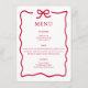 Clean, modern, and effortlessly stylish, this Christmas menu features bold red typography, a plain white background and a hand-drawn bow and border for a trendy coquette look. It’s perfect for a fashion-forward host who values simplicity.