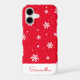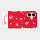 This cute Christmas iPhone 12 case features a trendy winter pattern with white stars and snowflakes on a red background. Personalize it with a name in the matching handwriting font.