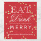 A bright and original holiday or Christmas party wine label featuring the traditional red colour and faux gold glitter confetti with a "Eat drink and be merry" typography lettering.