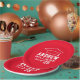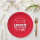 Custom round graduation paper plates features a red and white design (can be modified via "Customize It!") with a graduation cap and custom text for the grad's name and class year.