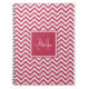 Personalized spiral notebook features a trendy chevron pattern in Viva Magenta (crimson red) with custom name in white handwriting and monogram in coral.