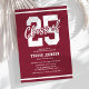 Masculine graduation party invitations featuring a red background that can be changed to fit your personal taste or match your school colours, with a bold white "25" emblazoned on the front, representing the class year and symbolizing the start of a new chapter in life. Plus sleek lines running across the top and bottom add a touch of modernity, giving them a sleek and sophisticated look that is sure to catch the eye of anyone who receives them.