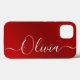 This phone case features a metallic red background with custom name in white brush script. Personalize by adding your name inside the first and last boxes when using the personalization tool. The boxes will created the flourishes at the beginning and end of your name. For example, when personalizing you will see this: Olivia