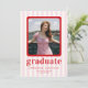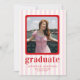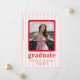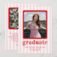 Celebrate in style with our chic and modern graduation announcement card. Featuring playful pink and white stripes as the backdrop, this design is adorned with bold red text for a vibrant and contemporary flair. Perfectly tailored to showcase your cherished photos, it’s a sophisticated way to announce your graduation.