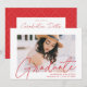 Invite guests to celebrate the graduation with our modern photo graduation party invites. The trendy graduation party invites feature the graduate's photo with "Graduate" in a red modern calligraphy script overlay. Personalize the front of the invites by adding the graduate's name, school name, and graduation year. The invite reverses to display your graduation party details and a trendy red and white dotted geometric pattern.