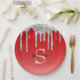 Modern Red Silver Glitter Drips Monogram Paper Plate