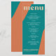 Abstract shapes retro vintage 70s style unique wedding menu card with bold typography in a vibrant trendy modern teal, beige tan and orange chic color palette. +++++++ Please note that all the colors are changeable. ++++++++++++ Suitable for informal casual stylish contemporary weddings.