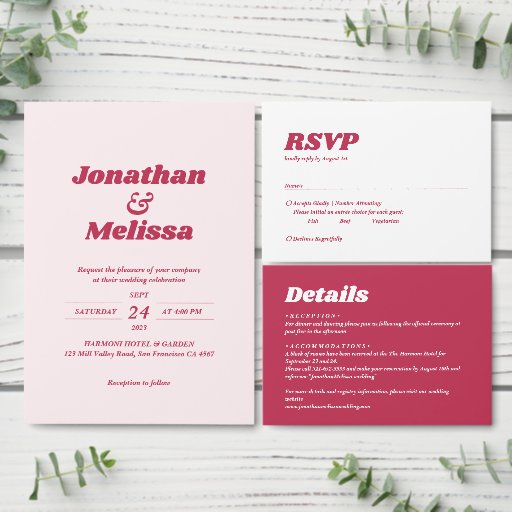A modern unique retro wedding invitation that features a stylish, elegant typography script with the trendy colour viva magenta and has a QR Code for the wedding website and all the details and instruction that your guest need in able for them to rsvp online and see your wedding website for all the details.