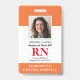 Modern Photo ID RN Registered Nurse Badge. Design featuring of medical orange and white background, single photo, hospital name, profession and name. Personalize with your bar code and contact details. Modern ID badges make it simple for customers and clients to identify employees. To edit this template click customize further.