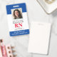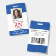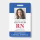 Modern Photo ID RN Registered Nurse Badge. Design featuring of medical blue and white background, single photo, hospital name, profession and name. Personalize with your bar code and contact details. Modern ID badges make it simple for customers and clients to identify employees. To edit this template click customize further.