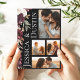 This modern styled wedding invitation features a collage of 4 of your cherished photos on the back. It is accented with burgundy, pink, and cream watercolor flowers and elegant foliage. The first names of the bride and groom are displayed in a modern white font against a black background. The front has the same flowers arranged to elegantly accent the corners on a white background. The bride and groom's names are accented with an ampersand. For longer or shorter names on the back of the card, you can enter the design tool to adjust font size and position.