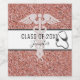 Designed with trendy pink rose gold faux glitter sparkle background and grey horizontal stripe on the centre with stethoscope silhouette on the side. Customized with graduate class year and personalized with name in white calligraphy script handwriting. Makes a great modern wine label for registered nurse, practitioner or female medical student graduation party.
