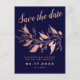 Share the big news! Send this save the date with mix between modern and vintage style with a hand painted rose gold botanical branch with leaves and flowers on an editable navy blue background. The modern typography and monogram adding a modern twist.