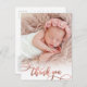 Elegant Modern Chic Calligraphy Rose Gold Script Photo Newborn Baby Thank You Postcard. Features a beautiful "thank you" text in a handwritten swash tail font calligraphy script in blush pink rose gold faux foil. At the back side pre-made personal message. Great for baby girl. Easy to personalize with your baby photo and details.