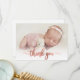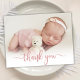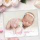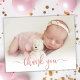 Simple Modern Elegant Calligraphy Pink Rose Gold Script Photo Newborn Baby Thank You Birth Announcement Card. Features a beautiful "thank you" text in a handwritten calligraphy swash tail font script in FAUX pink rose gold foil. Pre-made personal message at the back side. Great for baby girl or baby boy. Easy to personalize with your baby photo and details.