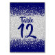 This modern table number card has a silver glitter effect on a deep royal blue background. You can change the font style and colour and also add each table number individually by going to the customize menu. This is part of a wedding suite with a matching menu, place cards and other essentials.