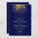 This elegant modern wedding invitation has a splash of gold confetti on a rich a royal blue background.