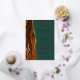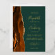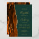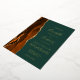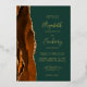 The left-hand edge of this elegant modern wedding invitation features a burnt orange and rust watercolor agate border trimmed with faux gold glitter. The customizable text combines handwriting, copperplate and italic fonts in real gold foil on a dark emerald green background. The reverse side features a matching burnt orange and gold agate design.