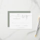 A simple elegant sage green script heart kindly reply RSVP card with your details set in chic typography. Designed by Thisisnotme©