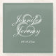 This custom wedding glass coaster features a modern and minimalist white calligraphy script design on a simple sage green background. Personalize with your names and wedding date. Best of wishes for your wedding and marriage! Designed by Susan Coffey.