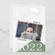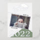 Modern Sage Green Graduate 2 Photo Graduation Silver Foil Invitation. Trendy silver foil graduation cap, grad script and 2022. Add your photo and name on the front and photo and invitation details on the backside.