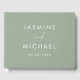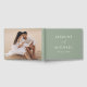 Simple, elegant wedding guest book featuring the couple's names and date displayed in white lettering with the date shown below against a sage green background. Personalize the spine of the guest book with your names, the date, etc. The back of the modern guest book displays your horizontal engagement photo. The chic sage green wedding guest book is perfect for modern weddings.