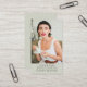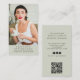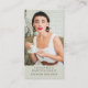 This business card features a professional photo, suitable for many professional titles that require a stylish feel, like fashion stylist, fashion designer, personal stylist, model, or other creative professionals. The reverse side features the contact info, social media and QR code. The background is a subtle sage green. Replace this photo with your own creative image.