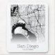 Modern black and white graphic shows outline map of San Diego, CA layout with major streets, highways and bodies of water.
