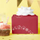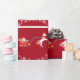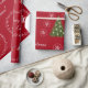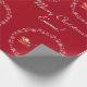 Elegant and cute personalized Christmas wrapping paper with Santa in his sleigh pulled by a unicorn, various snowflakes, and Xmas trees decorated with silver baubles. Perfect for little kids, especially little girls who like unicorns. With the greeting "Merry Christmas / Emma!" in cursive script / calligraphy. Make sure you personalize the name. On a Xmas red background.