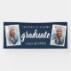 A fun way to show your pride for your graduate. Use photo banners at your events or as yard decor. This bold graduation banner features 2 photo apertures with large graduate type in centre and the name of the graduate and graduation year. Background colour is completely customizable as well as all fonts.
