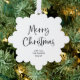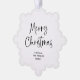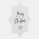 These simple and stylish black and white holiday ornament cards feature black modern script typography that says "Merry Christmas" on a white background. The back of the card has a minimalist, black and grey Christmas tree pattern.