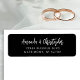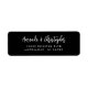 This simple, modern wedding return address label features the couple's names in stylish white script, with two lines for the address below in white sans serif font on a black background.