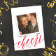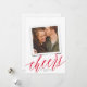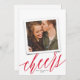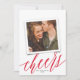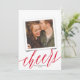 This modern yet elegant new year's photo card features a large script "cheers" in red over a classic white background with a single square photo. Over the photo is a faux photo frame image - actual design is not 3D. On the back of the card is the same white colour. **ALL colours are customizable - background colour, text colour, even the calligraphy script colour! Just click "customize design further" in the dropdown menu.**