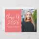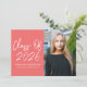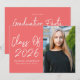 Modern graduation party invites featuring "Class of 2025" in a white handwritten script on a coral background. Personalize the front of the graduation invite by adding the graduate's name, school name, and vertical photo. The invite reverses to display your graduation party details in white lettering on a coral background.