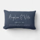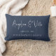 Modern Script Custom Coordinates Wedding Memories Lumbar Pillow featuring your coordinates and wedding date of choice, spouse's names in modern casual script font on a blue background. Great wedding keepsake or anniversary gift.